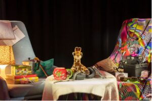 An example of an installation created by students; A Day in the life of this giraffe with on the left the past (work, reading, coffee/tea.) the present in the middle and the future (party, colours, creativity) on the right.